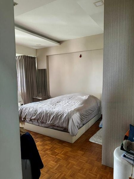 This well-maintained 3-bedroom condo boasts standout features, including parquet flooring in the bedrooms and built-in display shelving with accent lighting. The kitchen is a chef's dream, equipped with minimalist white cabinetry, sleek black countertops, and built-in appliances. The master bedroom is a tranquil retreat with neutral tones and a large window, while the second bedroom offers practical built-in wardrobes and an integrated study desk.