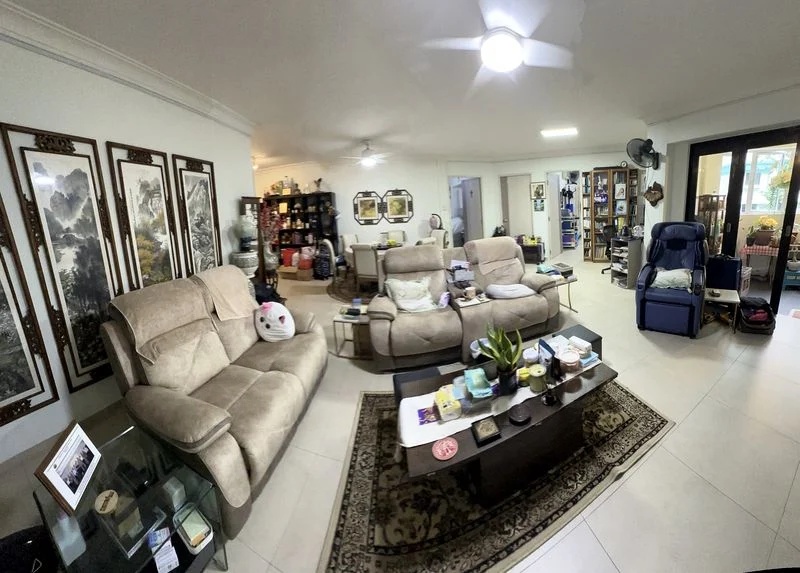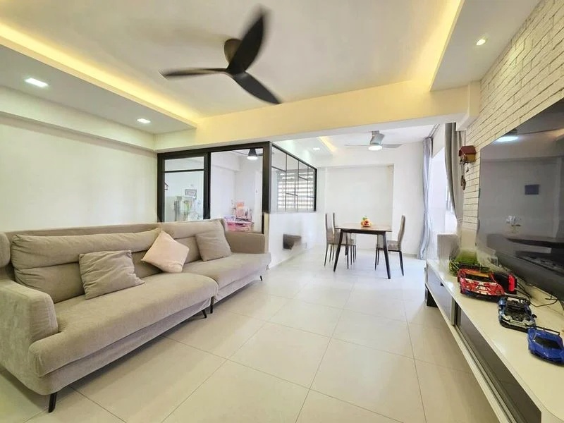 This well-maintained 3-bedroom unit features a spacious master bedroom with wood flooring and a striking purple accent wall, complemented by a luxurious walk-in wardrobe with full-length mirrors. The open-concept living area boasts a large L-shaped sofa, while the dining room is perfect for entertaining with its elegant glass-top table and pendant lighting. Each room is equipped with ceiling fans, ensuring comfort throughout the year.