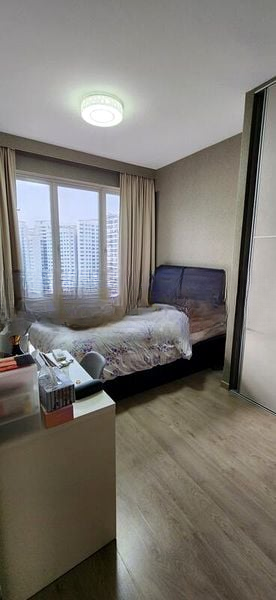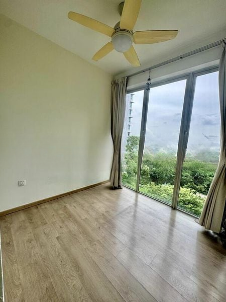 This thoughtfully designed unit features an open-concept layout that seamlessly connects the living and dining areas. The living room boasts a luxurious L-shaped sofa and a striking mirrored feature wall, while the dining area is illuminated by a modern circular pendant light. The master bedroom, complete with an en-suite bathroom and large windows, offers a tranquil retreat with stunning pool views. Additional highlights include a common bedroom with a study desk, perfect for work or study, and a balcony that serves as an outdoor workspace, enhancing your lifestyle.