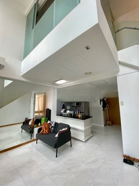 Step into a bright and airy sanctuary where abundant natural light floods through double-volume windows, illuminating the elegant finishes of this well-maintained loft unit. The stunning city skyline and greenery views create a serene backdrop, while the high ceiling and chandelier add a touch of sophistication to the living space.