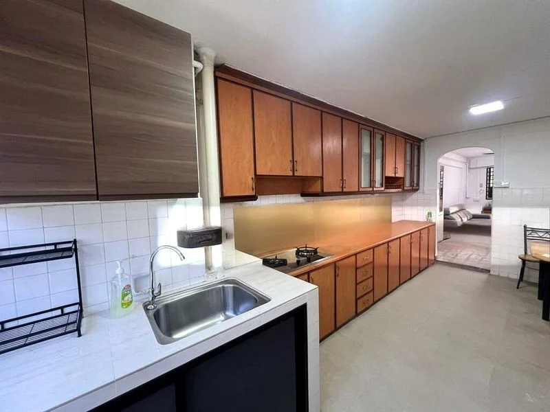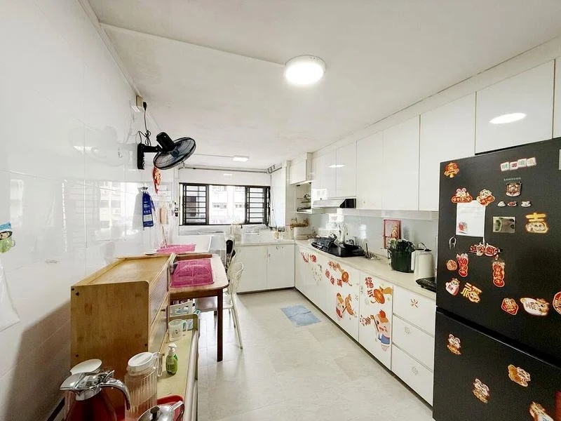 This thoughtfully designed unit features a spacious kitchen and dining area with white tiled walls and light-colored floor tiles, perfect for family meals. The bedrooms are equipped with essential furnishings, including a study desk in one room, while the bathroom boasts a mirrored medicine cabinet and a clean, modern aesthetic. With a total floor area of 721 sqft, this flat provides ample space for comfortable living.