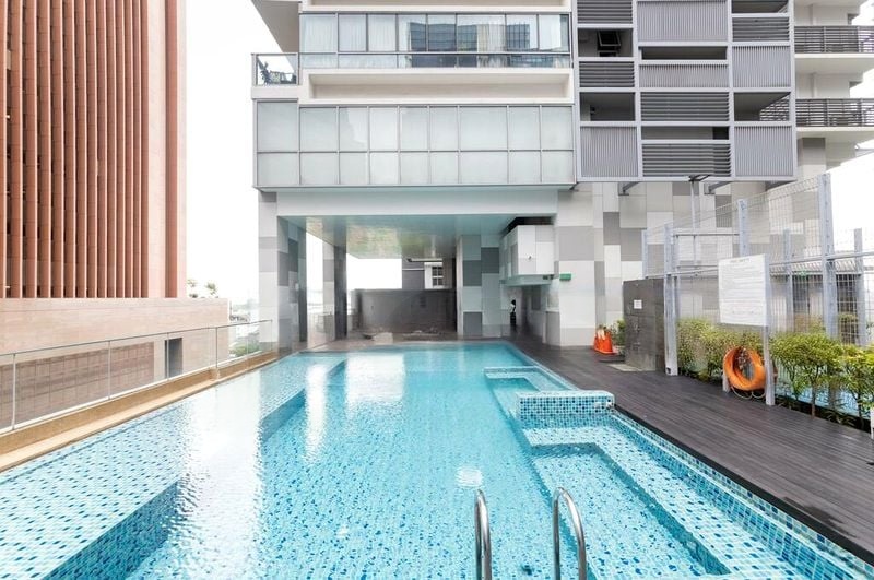 The layout is thoughtfully designed, featuring a spacious living area that seamlessly flows to a private balcony adorned with glass railings and integrated planters. Enjoy the luxury of a lap pool with stunning blue mosaic tiles, perfect for relaxation and leisure. The high ceilings and wooden decking enhance the overall aesthetic, making this unit a true urban oasis.