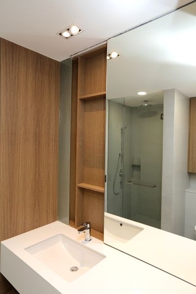 This well-maintained 3-bedroom unit boasts standout features including a luxurious rain shower, an integrated vanity sink, and floor-to-ceiling wardrobes that offer ample storage. The layout is thoughtfully designed, with a built-in floating desk and wall-mounted shelving in the bedroom, complemented by light wood flooring that enhances the airy feel of the space. The bathrooms are equipped with glass shower partitions and large vanity mirrors, ensuring a touch of luxury in your daily routine.