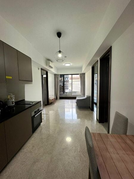 This well-maintained 2-bedroom unit features a stylish kitchen with built-in cabinets and an integrated oven, complemented by recessed lighting that enhances its minimalist design. The spacious bedroom boasts wood-look flooring and built-in wardrobes, while the bathroom showcases modern grey tiling, a glass shower partition, and a wall-hung toilet for a sleek finish. The balcony, equipped with an outdoor dining set and a privacy screen, invites you to unwind amidst nature.