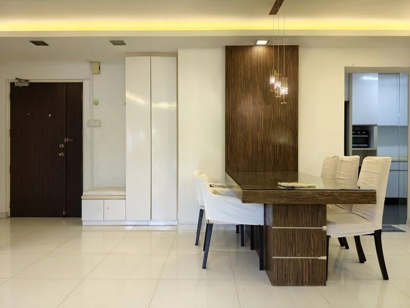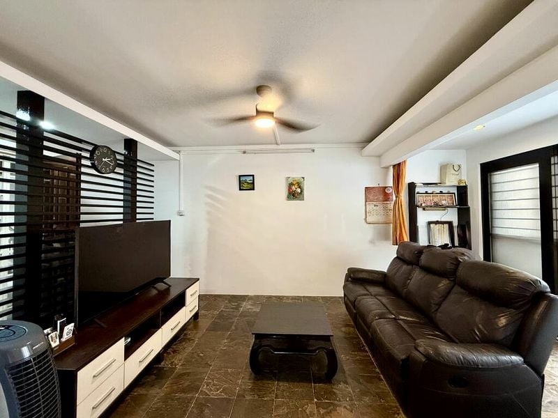 Step into a serene oasis where modern comfort meets nature. This well-maintained 3-bedroom flat features textured stone floor tiles that invite you into a spacious living room, adorned with a slatted wood room divider and integrated ceiling fan light. Natural light filters through large windows, offering unblocked views of lush greenery and the nearby park, creating a cozy and functional ambiance.