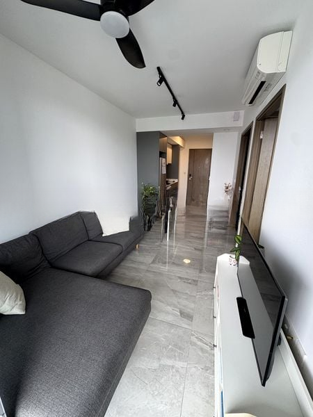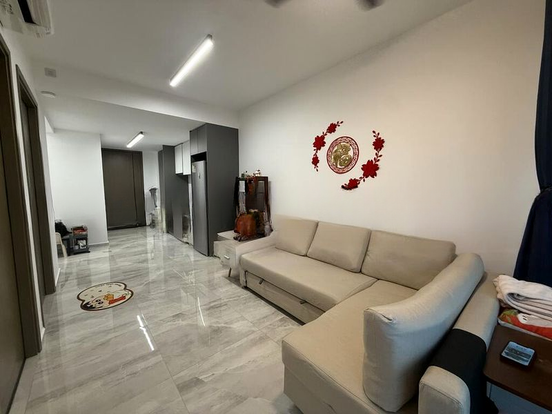 Step into a world of modern elegance as you enter this beautifully renovated unit at Affinity at Serangoon. The inviting ambiance is accentuated by a stunning marble-look feature wall and a large marble-look coffee table, complemented by soft natural light filtering through sheer curtains. Enjoy the cozy atmosphere created by the ceiling fan with wooden blades and modern pendant lighting, all while overlooking lush greenery from the living room.