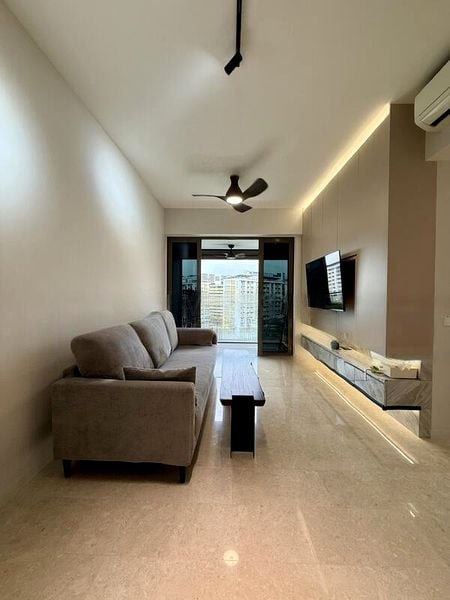 Step into a world of modern elegance as you enter this beautifully renovated unit at The Tre Ver. Bathed in abundant natural light, the open living area features polished stone flooring and an integrated TV console with cove lighting, seamlessly leading to a private balcony that offers breathtaking views of the city skyline. The minimalist design creates a serene ambiance, perfect for relaxation and entertaining.