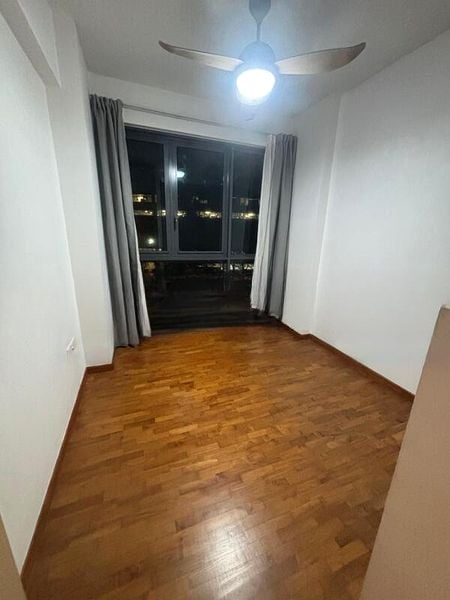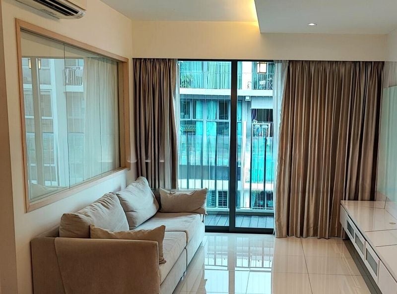 This efficient 77 sqm (829 sq ft) layout boasts a dedicated dining area and a utility/store room. The master bedroom is a serene retreat with large windows and both sheer and blackout curtains, while the second bedroom features wood flooring and built-in cabinetry. The bathrooms are designed for comfort, featuring a rain shower and a floating vanity, complemented by contemporary contrast wall tiling. The galley kitchen is equipped with a gas hob and an integrated washing machine, perfect for modern living.