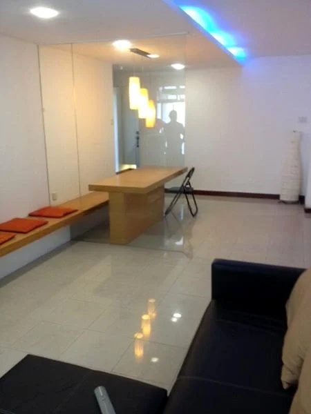 Step into a well-maintained 4-room flat that exudes a clean and functional ambiance. The spacious living area welcomes you with an L-shaped leather sofa and large windows that fill the space with natural light, offering a pleasant urban view of neighboring HDB blocks.