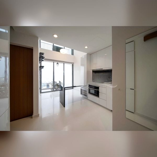 This loft-style layout features standout elements such as a sleek black island dining table, a built-in wine chiller, and a spiral staircase that adds a touch of sophistication. The kitchen boasts white gloss cabinetry, an integrated oven, and an induction hob, making it a chef's dream. With two spacious bedrooms and two well-appointed bathrooms, this unit is designed for both comfort and style.
