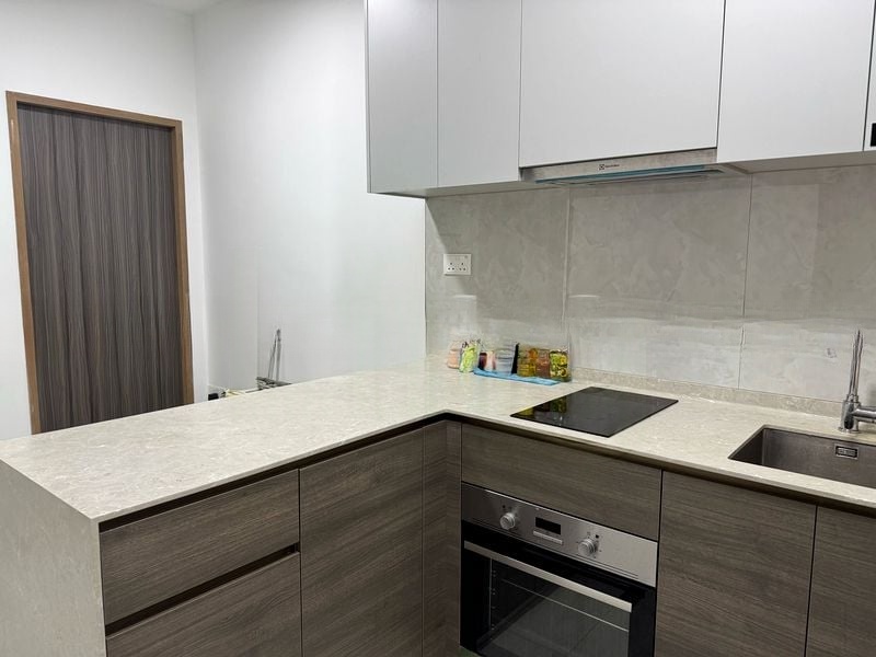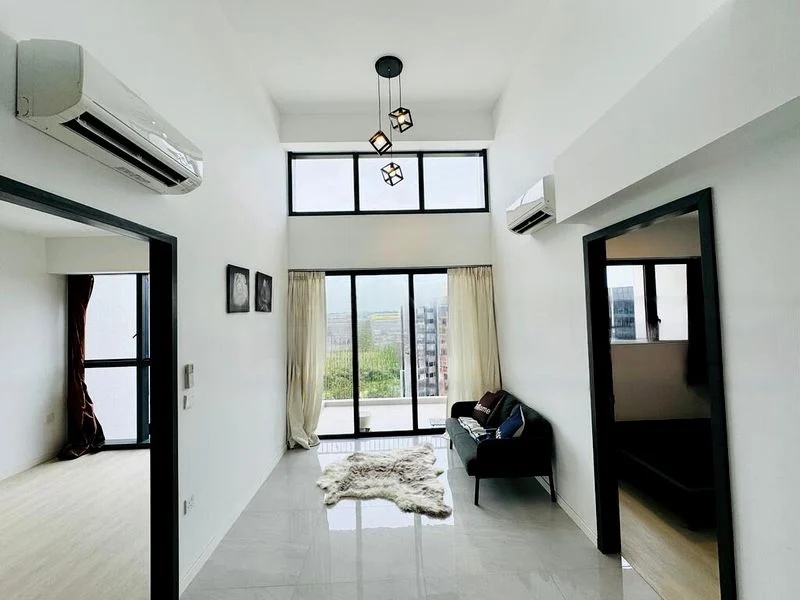 Step into a sanctuary of light and space at Riverfront Residences, where the double-volume living area greets you with abundant natural light and stunning views of lush greenery. The polished tile flooring and geometric pendant lights enhance the airy ambiance, creating a welcoming atmosphere that invites relaxation and enjoyment.