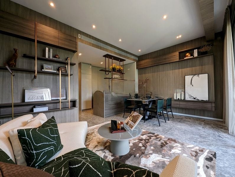 Step into a world of modern luxury at this brand-new designer unit, where abundant natural light floods the space through floor-to-ceiling windows, illuminating the exquisite marble-patterned floor tiles and elegant wood-paneled feature walls. The ambiance is both inviting and sophisticated, enhanced by integrated cabinet lighting and stylish designer pendant lights that create a warm, welcoming atmosphere.