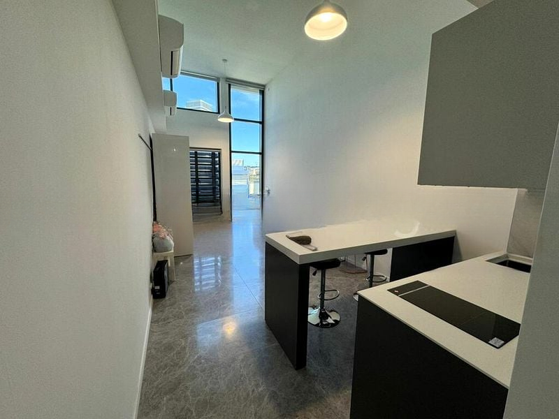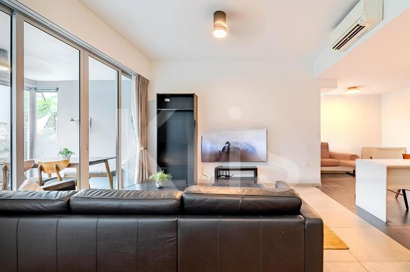 This thoughtfully designed unit features a seamless flow from the living room to the balcony, where you can enjoy unobstructed views. The minimalist kitchen is equipped with integrated appliances and sleek cabinetry, while the bedroom boasts dark wood flooring and grey blackout curtains for a restful retreat. The modern bathroom, complete with a large mirrored vanity and glass shower partition, adds a touch of luxury to your daily routine.