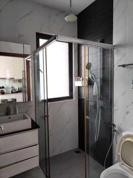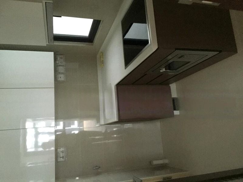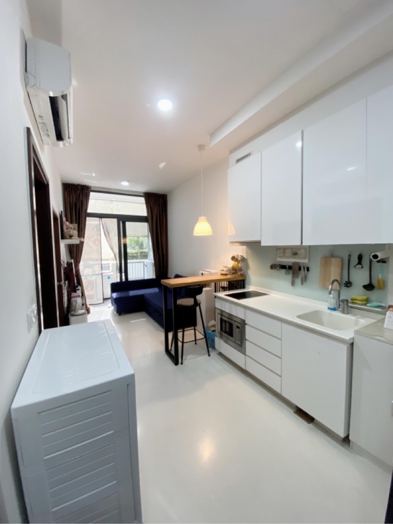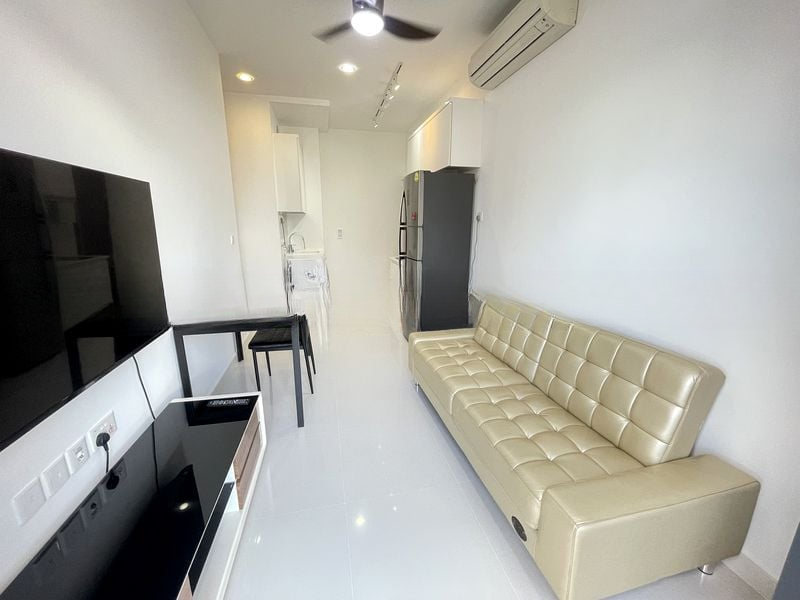 This well-maintained 1-bedroom unit features a loft bed that maximizes space, complemented by a stylish glass railing and recessed ceiling lights. The open-concept living area boasts an L-shaped blue sofa and a wall-mounted TV, perfect for relaxation. The kitchen is a chef's dream with high-gloss white cabinetry, an induction hob, and a breakfast bar that invites casual dining. The bathroom showcases a luxurious rain shower and elegant marble-look tiles, while the study area offers a full-height mirrored wardrobe and dedicated workspace.