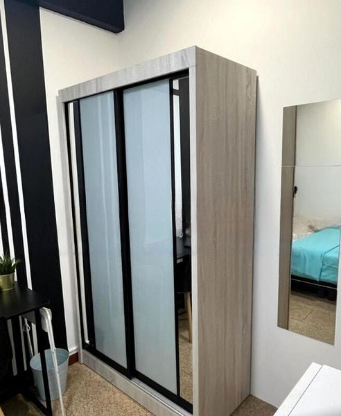 This fully-furnished 1-bedroom unit features a thoughtfully designed layout, including a cozy bedroom with a queen bed, sliding wardrobe, and a chest of drawers for ample storage. The second bedroom, adorned with a striking black feature wall and framed wall art, doubles as a study space with a dedicated desk, perfect for work-from-home arrangements. The tiled flooring enhances the modern aesthetic, making this space both stylish and functional.