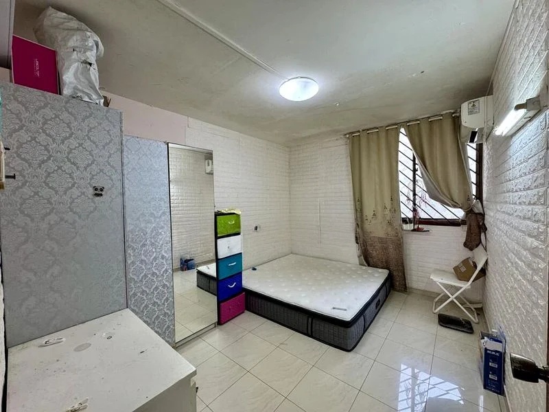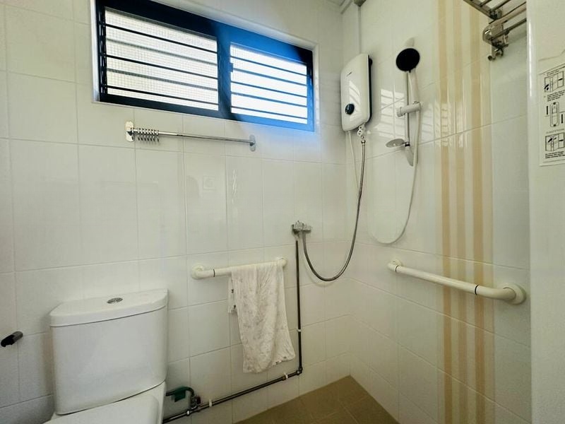 This thoughtfully renovated flat boasts three spacious bedrooms, including a master suite with a luxurious diamond-tufted headboard and a walk-in wardrobe adorned with built-in drawers and a pendant light. Each bedroom is designed with unique features, from the purple accent wall in the second bedroom to the checkered headboard in the third, complemented by built-in study areas for added convenience.