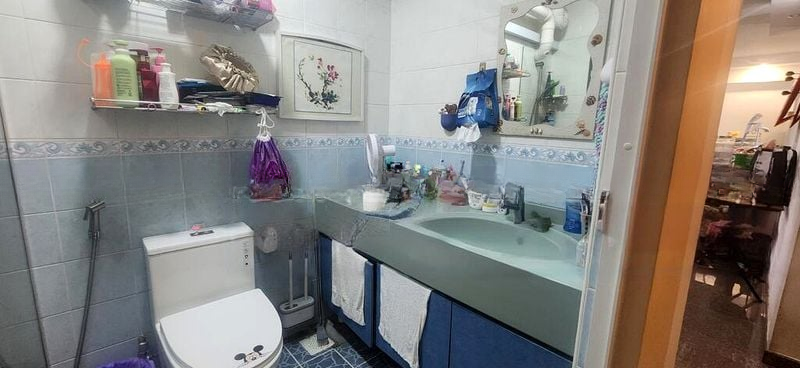 Spanning an impressive 130sqm, this unit features a dedicated study with a stylish sliding frosted glass door, perfect for work or relaxation. The spacious living and dining area boasts tiled flooring and a large white grid shelving unit, while the enclosed balcony offers a tranquil space for potted plants and outdoor enjoyment. With three well-appointed bedrooms and a practical layout, this home is designed for both comfort and functionality.