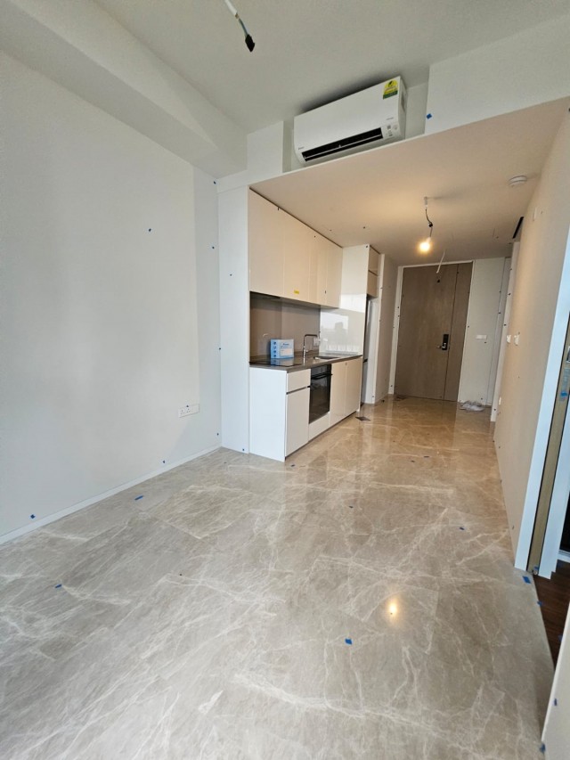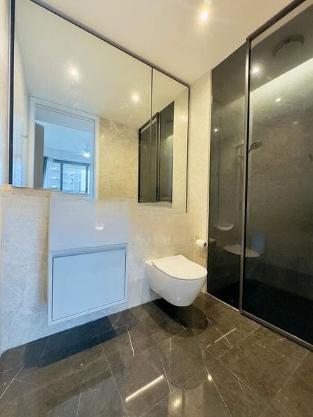 This well-maintained unit boasts a modern layout with standout features including a fully-equipped kitchen with integrated appliances, a spacious living room adorned with abstract wall art, and a stylish bathroom featuring a floating toilet and large vanity mirror. The bedroom is a serene retreat, complete with a built-in wardrobe and a ceiling fan, ensuring comfort and convenience.