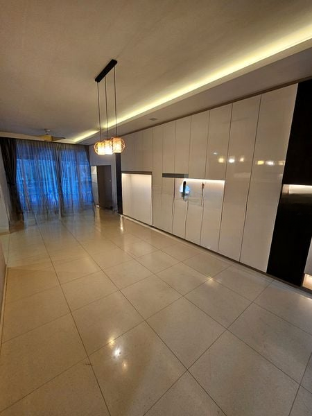 This well-maintained 3-bedroom unit boasts standout features including a stylish galley kitchen with dual-tone cabinets, a sleek stainless steel backsplash, and a black glass hob. The dining area, highlighted by a marble-look dining table and a wooden slat partition, provides a sophisticated touch. Built-in storage cabinets throughout ensure ample space for all your needs, while the tiled flooring adds a modern flair to the living space.