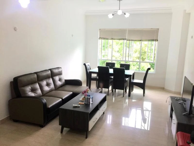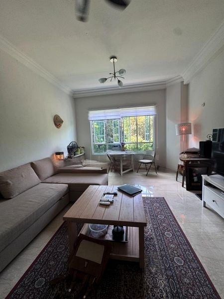 Step into a warm and inviting atmosphere at this beautifully maintained 3-bedroom unit in LE WOOD. Bathed in natural light, the living area features polished stone floor tiles and large windows adorned with double curtains, offering serene views of lush greenery. The cozy ambiance is complemented by elegant finishes, including a large wall mirror in the dining area that enhances the sense of space.