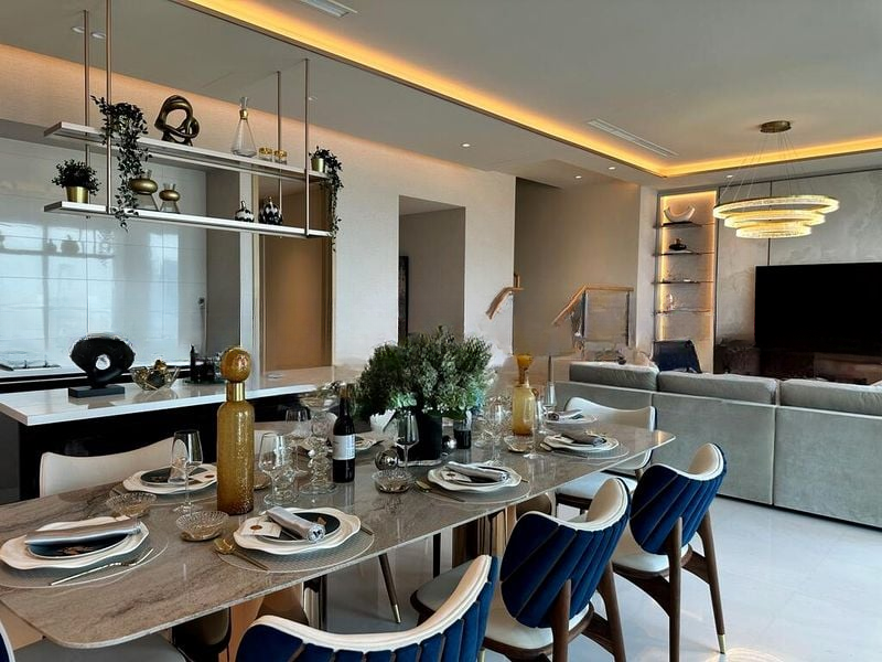 Step into a world of elegance as you enter this brand-new designer duplex penthouse. Bathed in natural light, the open-concept living and dining areas feature a striking marble dining table, complemented by a tiered circular gold chandelier that casts a warm glow. Floor-to-ceiling glass doors invite breathtaking views of the waterway, city skyline, and lush greenery, creating an ambiance that is both luxurious and modern.
