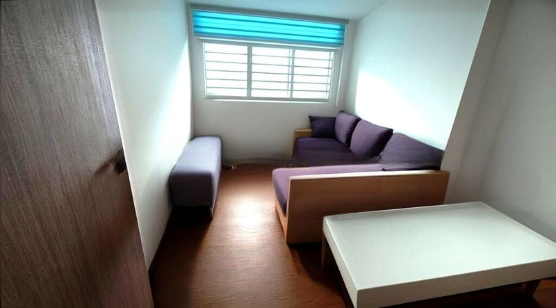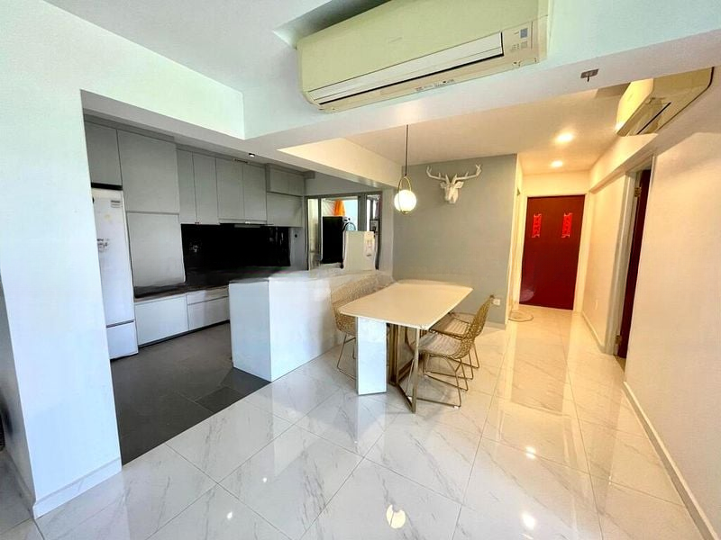 Step into a world of modern elegance as you enter this beautifully renovated HDB flat at 103A Canberra St. The inviting ambiance is accentuated by custom wall murals and track lighting, creating a vibrant yet cozy atmosphere. Natural light filters through the space, highlighting the sleek black cabinetry in the open-concept kitchen and the chic furnishings in the living room, including a stylish black leather sofa and a cheerful yellow area rug.