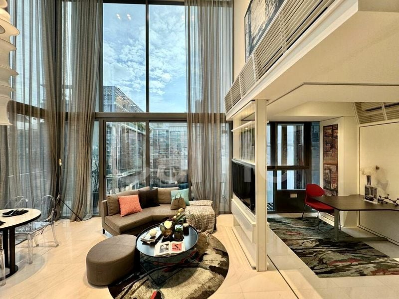 Step into a world of modern elegance as you enter this beautifully renovated unit at UP@Robertson Quay. The open-concept living area is bathed in natural light, showcasing stunning views of the city skyline through large windows. The contemporary finishes, including recessed lighting and a chic grey fabric sofa, create an inviting ambiance that feels both spacious and intimate.