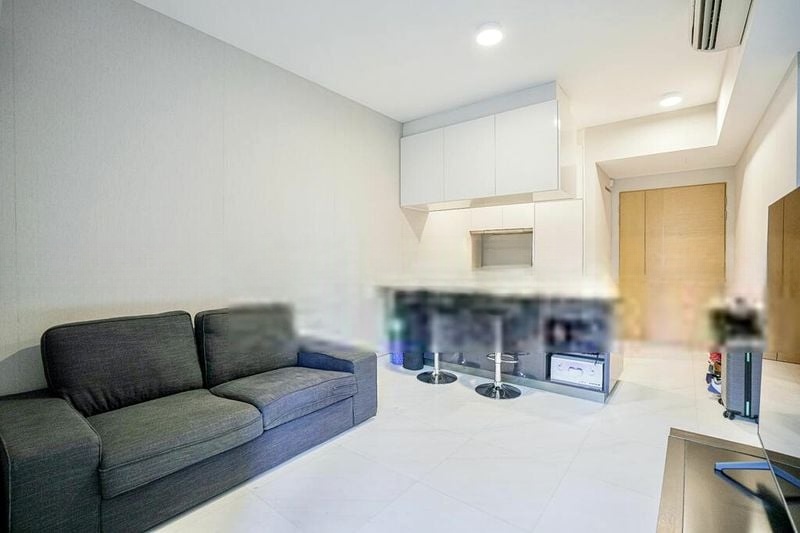 This one-bedroom condo features a stylish island kitchen equipped with an integrated oven and sleek white countertops, perfect for culinary enthusiasts. The bedroom offers a tranquil retreat with a tufted headboard, built-in wardrobe, and large window adorned with grey curtains. Enjoy seamless indoor-outdoor living with direct access to the balcony, ideal for unwinding after a long day.