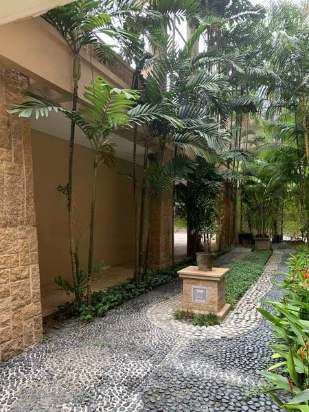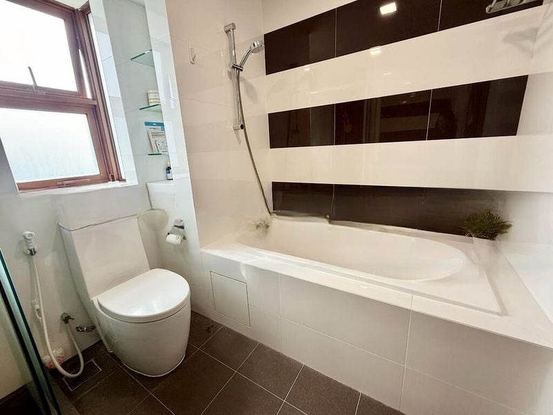 Step into a warm and inviting atmosphere as you enter this beautifully maintained 3-bedroom unit at Tropical Spring. The open-plan living and dining area is bathed in natural light, featuring polished tile flooring and a large wall mirror that enhances the sense of space. The cozy ambiance is complemented by a ceiling fan and an L-shaped sofa, perfect for relaxation and entertaining.