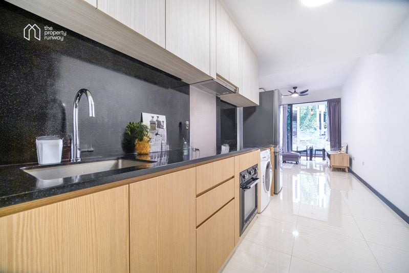 This well-maintained unit features a compact yet efficient layout, boasting a stylish bedroom with wood-look laminate flooring and floor-to-ceiling curtains that enhance the sense of space. The modern bathroom, complete with a glass shower screen and chic black-and-white tiling, adds a touch of luxury. The kitchenette is equipped with an induction hob and integrated cabinetry, making it both functional and aesthetically pleasing. With a dual-key potential layout, this unit offers versatility for various living arrangements.