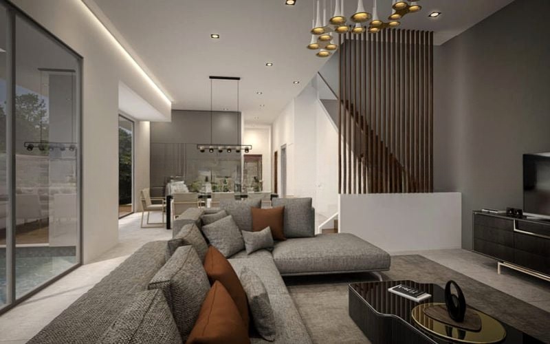 This exquisite property features six generous bedrooms and six bathrooms, ensuring ample space for family and guests. The standout architectural design includes large glass sliding doors that seamlessly connect the indoor and outdoor spaces, complemented by a private lap pool and an integrated outdoor water feature. The multi-textured facade, adorned with stone and wood accents, adds a touch of sophistication to this remarkable home.