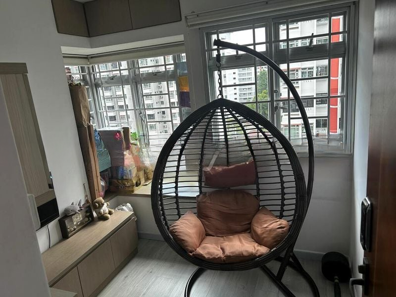 This well-maintained unit boasts a functional layout with standout features including extensive built-in storage, a galley kitchen with sleek black countertops, and a unique enclosed nook complete with a hanging egg chair. The master bedroom is a sanctuary with floor-to-ceiling wardrobes and a wall-mounted TV, while the additional bedroom and study provide ample space for work and rest. Each room is equipped with ceiling fans for added comfort.