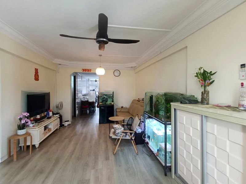 Step into this beautifully renovated 3-bedroom flat and be greeted by a cozy ambiance that invites relaxation. The living room features a stunning mirrored wall that enhances the sense of space, complemented by wood-look flooring and a built-in TV console. Natural light filters through large windows, offering views of lush greenery and neighboring HDB blocks, creating a serene backdrop for everyday living.