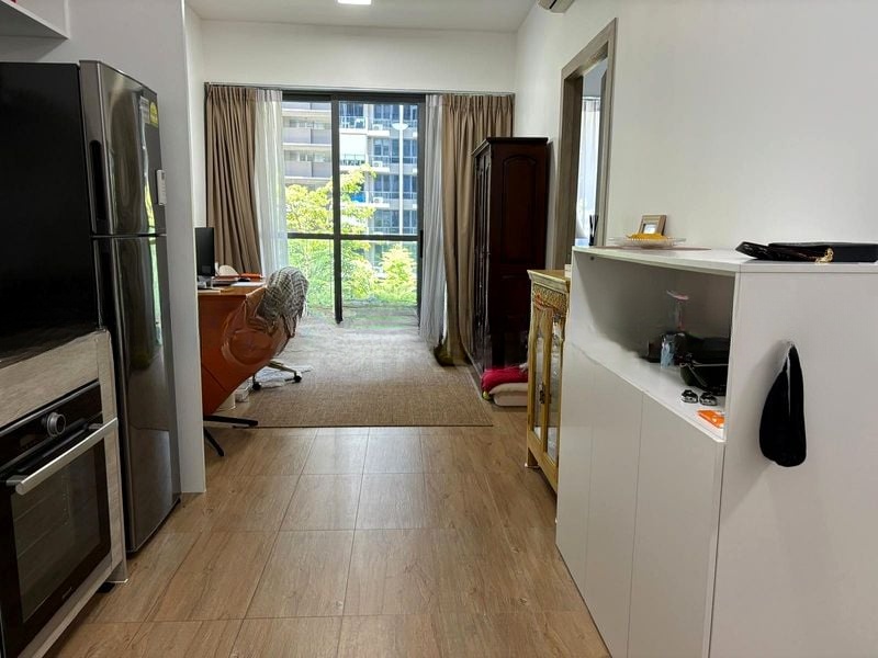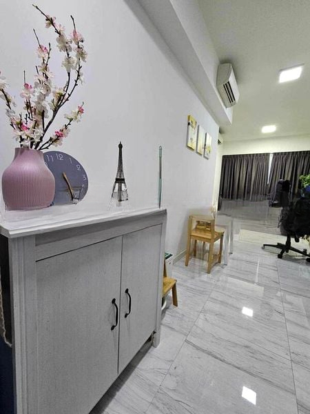 Step into a bright and airy sanctuary at The Alps Residences, where abundant natural light floods the open-concept living area through floor-to-ceiling balcony doors. The seamless integration of wood-look tile flooring and a marble-patterned backsplash in the kitchen creates a modern yet inviting ambiance, while the balcony offers a serene view of lush greenery, perfect for unwinding after a long day.