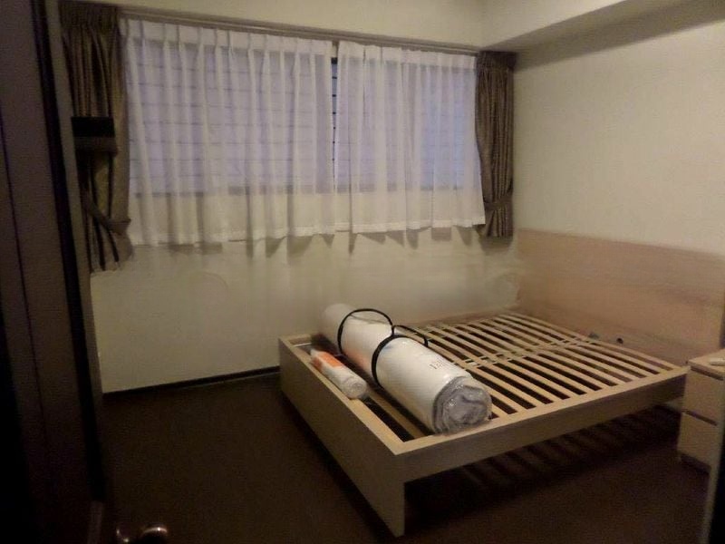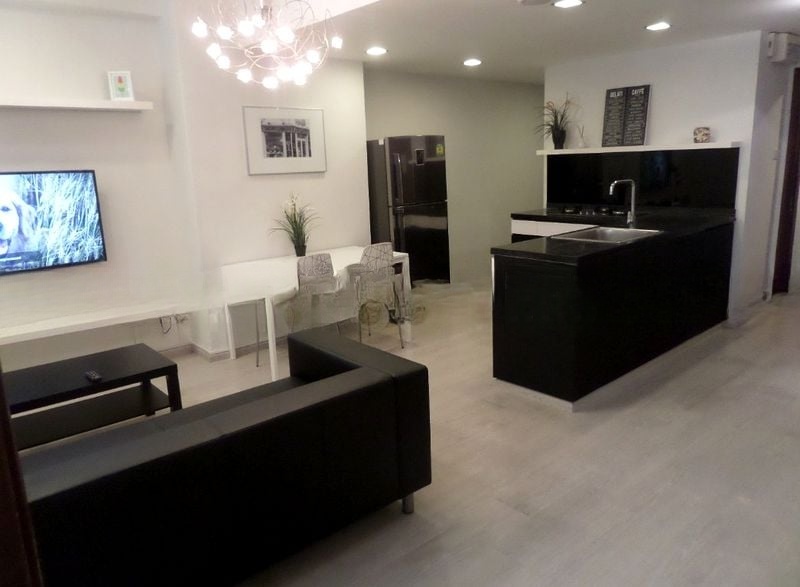 This well-maintained condominium features three spacious bedrooms, including a master suite with an en-suite bathroom. The standout room boasts a floor-to-ceiling mirrored wardrobe, enhancing the sense of space and light. The modern bathroom is elegantly designed with dark tiled walls and a dedicated vanity area, ensuring comfort and convenience for residents.