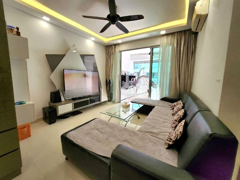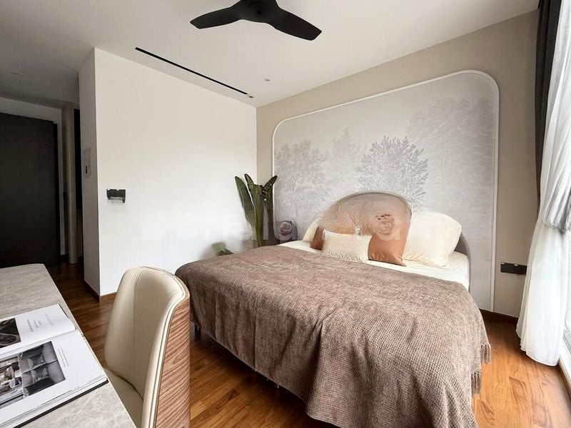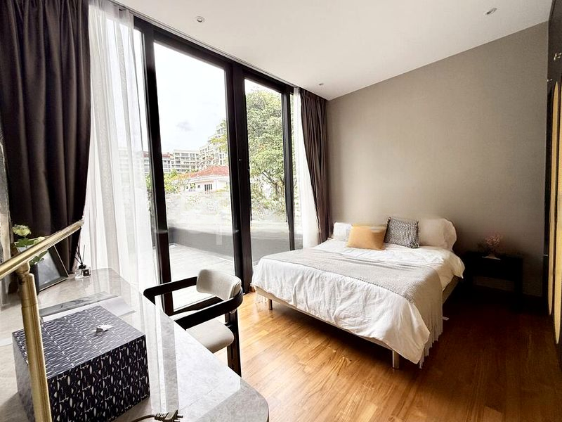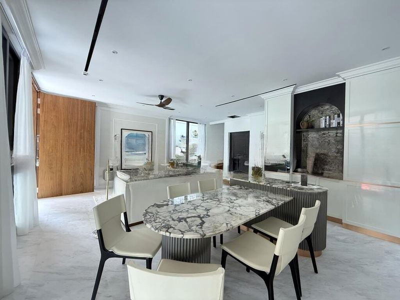 This thoughtfully designed 6-bedroom unit boasts standout features including a chic integrated marble-look dining island, modern white cabinetry in the kitchen, and a striking tree mural in the master bedroom. The custom-built study area with arched display shelving offers a perfect workspace, while the balcony, adorned with a wooden ceiling and recessed lighting, provides an ideal spot for unwinding after a long day.
