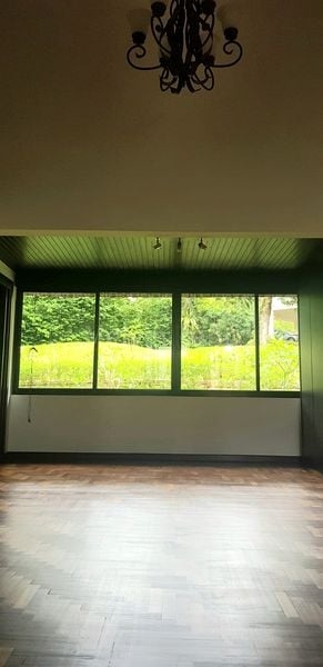 Step into a cozy sanctuary at Hillcrest Arcadia, where warm natural light dances across the high ceilings and elegant parquet flooring. The inviting living room, adorned with a classic chandelier and large windows, offers a serene view of lush greenery, creating a tranquil ambiance that feels like home.