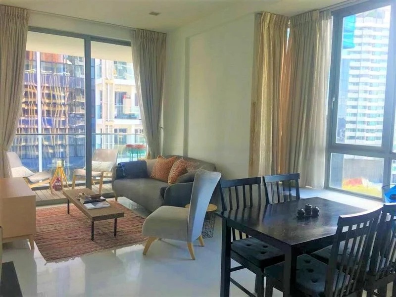 Step into a bright and airy sanctuary at SUITES @ SURREY, where abundant natural light dances across polished tile flooring and highlights the modern finishes throughout. The living room, adorned with sliding glass doors, seamlessly connects to a wooden-decked balcony that offers stunning views of the city skyline and pool, creating an inviting atmosphere for relaxation.