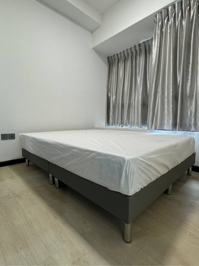 This efficient 43 sqm Type F layout features a well-appointed bedroom with a dark brown tufted headboard and polished tile flooring, complemented by a dedicated study area ideal for remote work. The open-plan living room seamlessly connects to a private balcony, while the bathroom boasts contemporary finishes, including a glass shower screen and a hand bidet spray for added comfort.