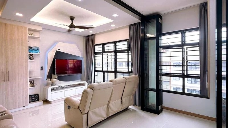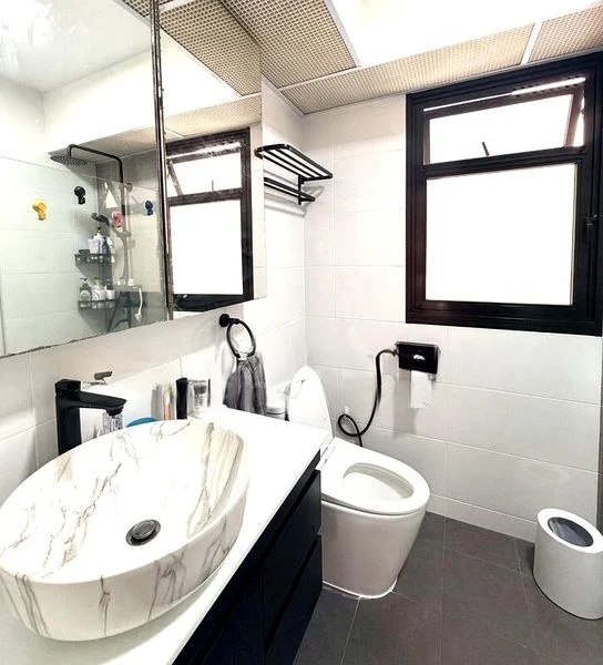 Step into a beautifully renovated 3-bedroom flat that exudes a bright and airy ambiance. The abundant natural light floods the living space, highlighting the modern TV feature wall and elegant false ceiling with cove lighting. Large windows offer a pleasant view of the neighboring HDB blocks and the city estate, creating a welcoming atmosphere from the moment you enter.