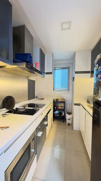 This well-maintained 2-bedroom condominium features an efficient layout, with a master suite that boasts a large built-in wardrobe and en-suite access. The galley kitchen is a chef's delight, equipped with a built-in oven, gas cooktop, and stainless steel backsplash, complemented by a ventilation window for fresh air. Enjoy the convenience of a second bedroom, perfect for guests or a home office, and relax on the balcony with artificial turf flooring and glass railings, offering a high-floor view.