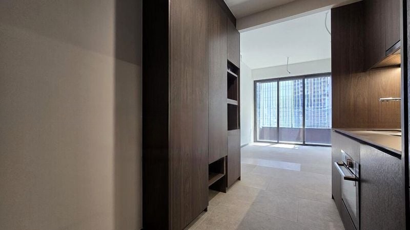 This thoughtfully designed 1-bedroom unit features an open layout, seamlessly connecting the living room to a private balcony where you can unwind while soaking in panoramic views of DUO Tower and Raffles Hospital. The bedroom boasts a built-in floor-to-ceiling wardrobe and dark wood flooring, while the bathroom is a sanctuary of style with its glass shower enclosure and large vanity mirror adorned with gold trim. With split-unit air conditioning in all rooms, comfort is guaranteed.