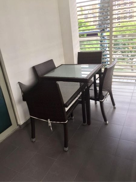 This efficient 2-bedroom, 2-bathroom layout features a dedicated household shelter and a stylish galley kitchen adorned with black stone countertops and white cabinetry. The en-suite master bedroom offers a queen-sized bed and air-conditioning for your comfort, while the common bedroom boasts warm wood flooring and a cozy double bed. Step outside to your private balcony, complete with slatted privacy screens and outdoor dining furniture, perfect for enjoying tranquil moments.