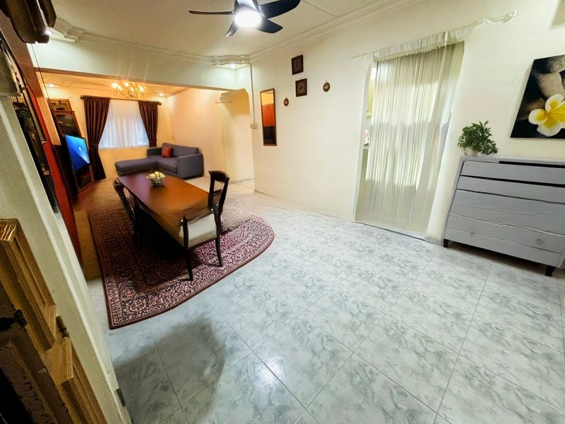 Step into this inviting 2-bedroom flat, where the charm of original finishes greets you at the door. The arched entrance leads you from the living room, adorned with white square tiled flooring and ceiling-mounted lights, into a spacious kitchen that beckons with its generous layout and louvered windows, allowing for a gentle breeze and views of the surrounding greenery.