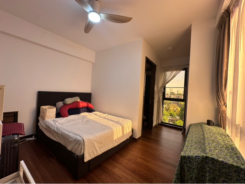 This well-maintained unit features a thoughtful layout, including an en-suite master bedroom with a walk-in wardrobe, and a galley kitchen equipped with integrated appliances. The modern marble-look bathroom tiles and sleek cabinetry add a touch of sophistication, while the warm wooden flooring in the bedrooms enhances the cozy atmosphere. With a household shelter for additional storage, this home is designed for both style and practicality.