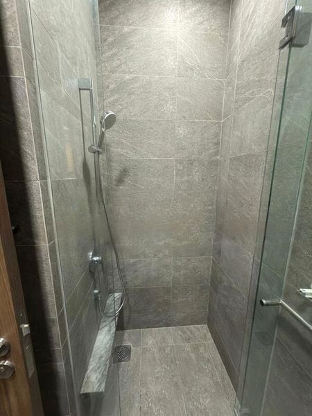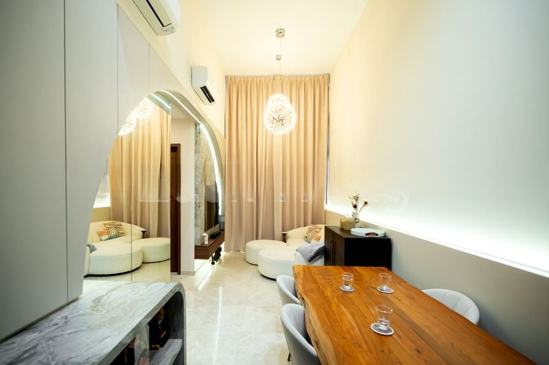 Step into a world of modern minimalist elegance at Daintree Residence, where abundant natural light floods the space through floor-to-ceiling windows, offering serene views of lush greenery and charming residential rooftops. The high ceilings enhance the airy ambiance, while designer finishes, including black marble vanity tops and a wood-paneled balcony ceiling, create a sophisticated atmosphere that invites relaxation.