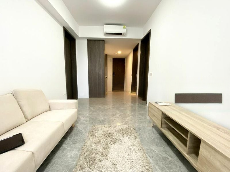Step into a world of modern elegance as you enter this brand-new 2-bedroom unit at THE M. Bathed in abundant natural light, the open living space features exquisite marble-look floor tiles and floor-to-ceiling windows that frame breathtaking views of the pool and city skyline. The neutral colour palette, complemented by a ceiling fan and balcony access, creates a serene ambiance perfect for relaxation.