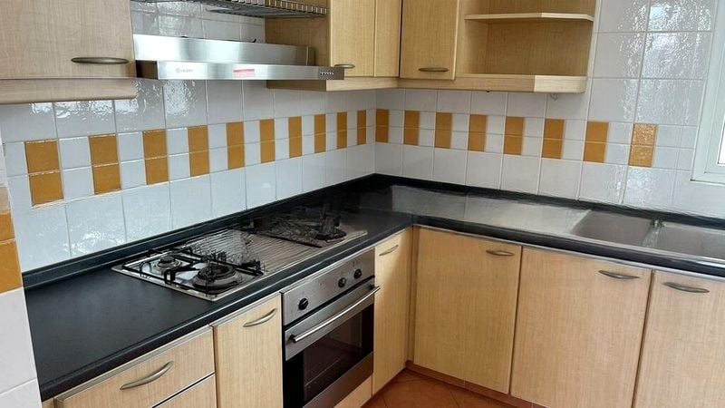 This well-maintained unit features three comfortable bedrooms, each adorned with parquet flooring and a large built-in sliding wardrobe for ample storage. The master bedroom boasts a full-height padded headboard, adding a touch of luxury to your retreat. The L-shaped kitchen is equipped with wood-grain laminate cabinets, a gas hob, and a stylish tiled backsplash, making it both practical and aesthetically pleasing. The service yard includes a top-loading washing machine for added convenience.