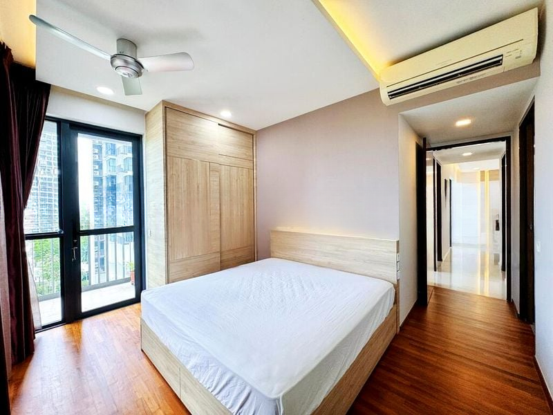 This 3-bedroom, 3-bathroom condo boasts a well-thought-out layout, featuring a spacious living room with dual air conditioning units and a cozy dining area adorned with a wooden table and vibrant yellow accent chairs. Each bedroom is designed for comfort, complete with built-in wardrobes and ceiling fans, while the modern bathrooms showcase sleek fixtures and patterned wall tiles that elevate the overall aesthetic.