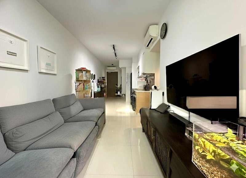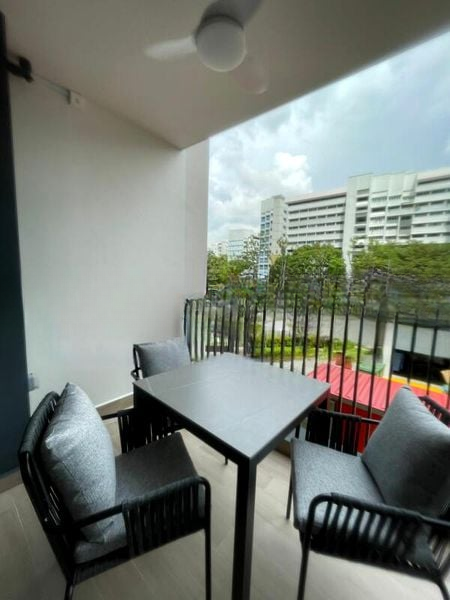 Step into a world of tranquility as you enter this brand-new 1-bedroom unit at Treasure at Tampines. Bathed in abundant natural light, the open-concept living and dining area features polished white floor tiles and sleek black track lighting, creating a bright and airy ambiance. Floor-to-ceiling sliding glass doors lead to a private balcony, where you can unwind and enjoy unobstructed views of lush greenery.
